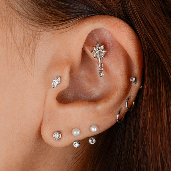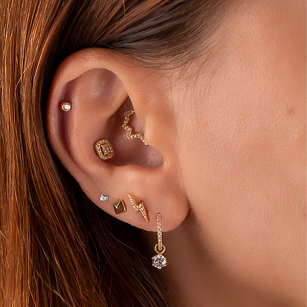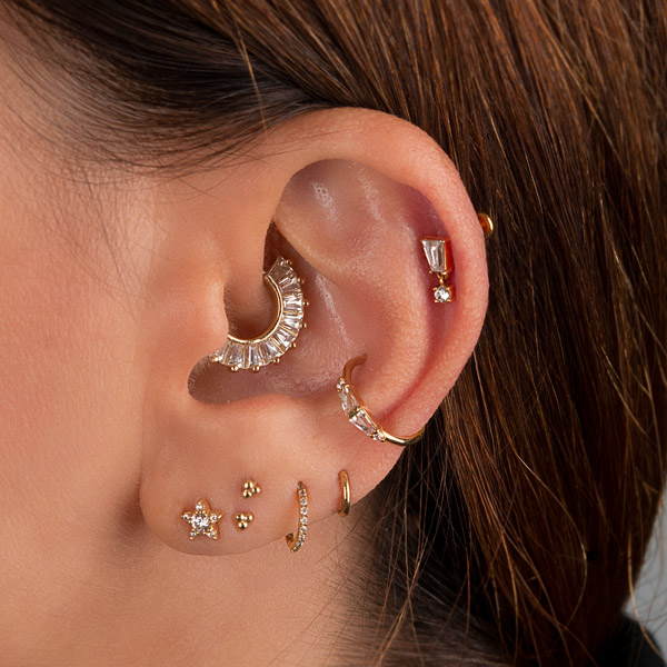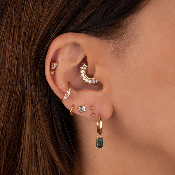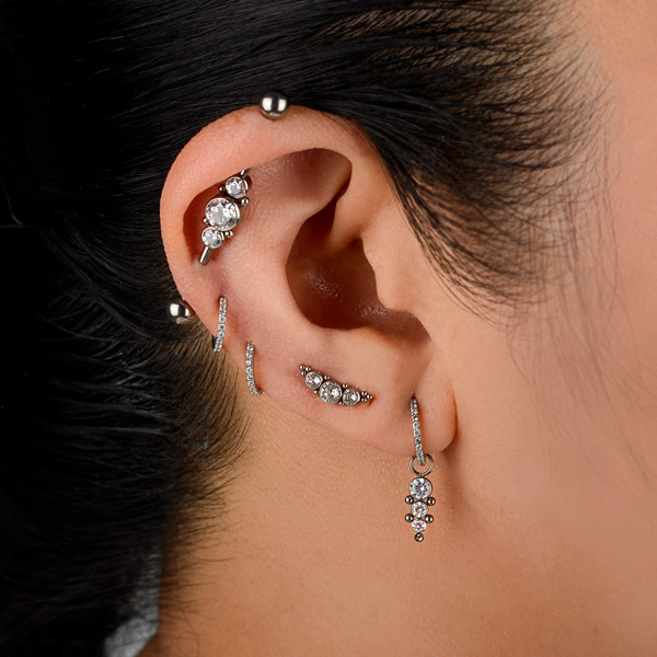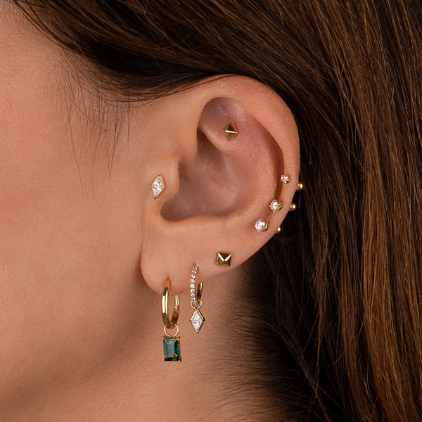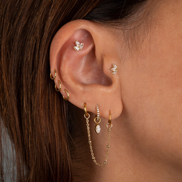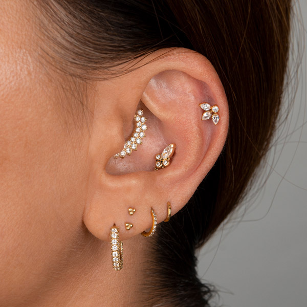 Our designer, Arabela Redl, has decades of experience handcrafting chic jewelry. Her range on offer at AROBELA is aimed to bring sophistication, elegance and individualism to your ear, face and body piercings. Here, we have selected some key looks for each area of the ear to achieve an overall ‘Bespoke Bling’ curation brought to you by AROBELA.